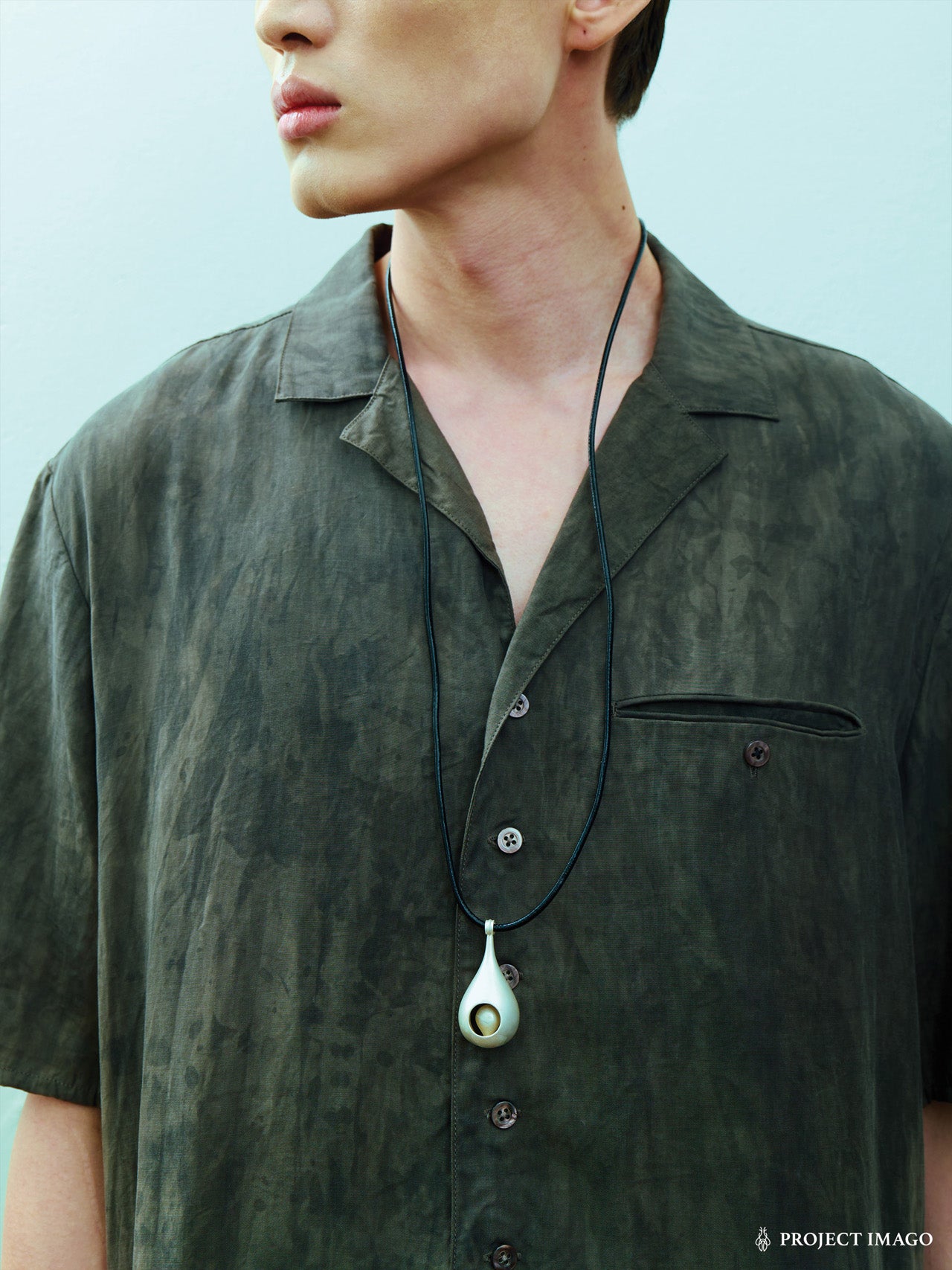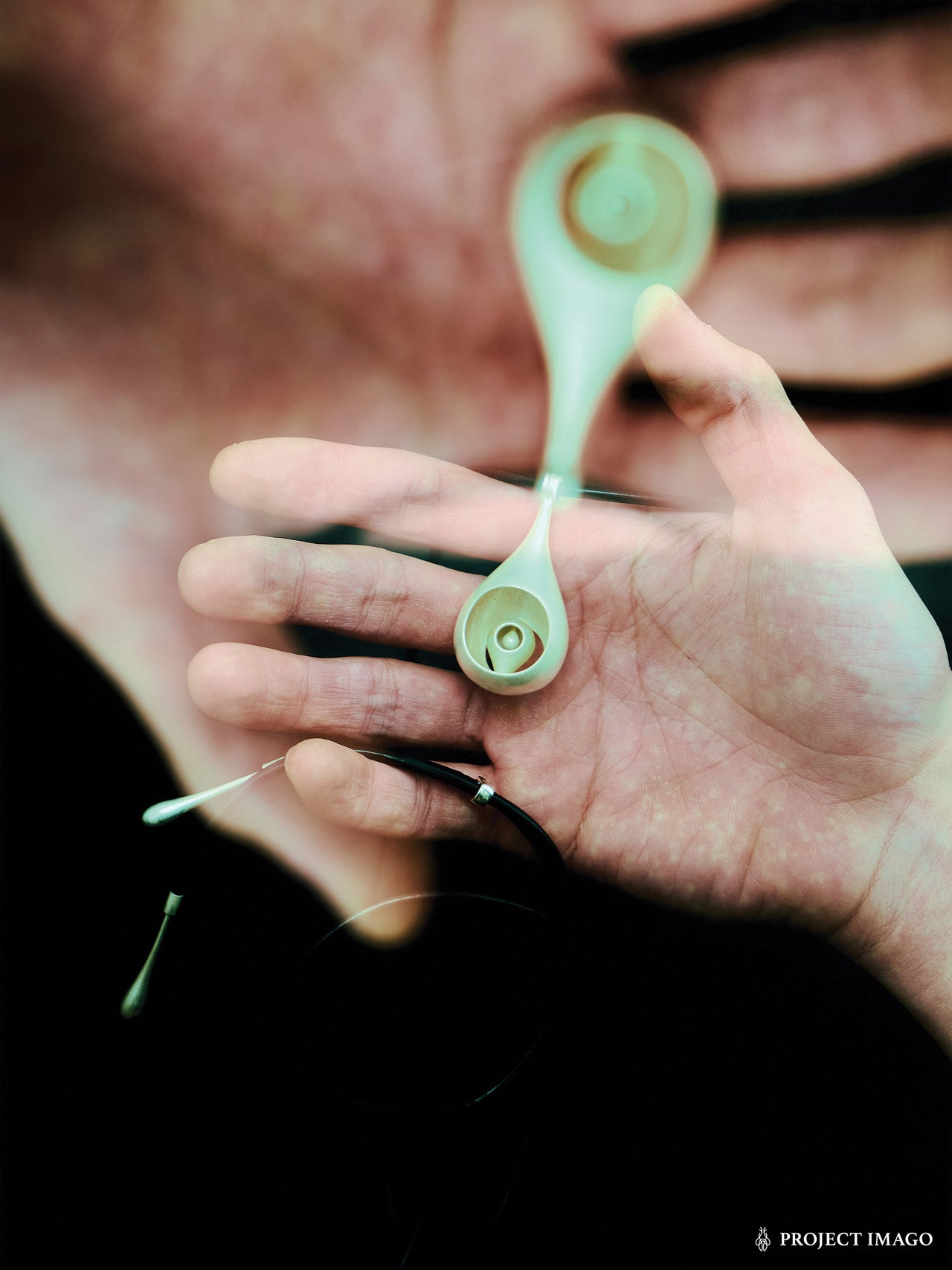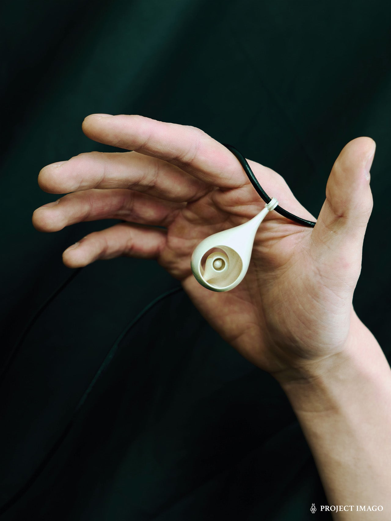 From Project Imago Q4. A waist-length pendant of nested teardrops, cast in one piece. Fluid yet enclosed, like a shrine or distilled lifeform. Worn on adjustable leather cord with twin teardrop weights.